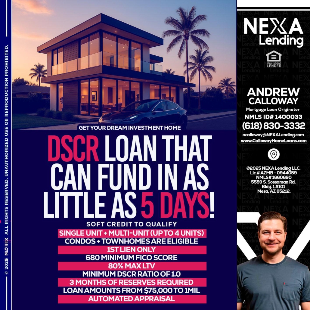 Hi, my name is Andrew Calloway. I’m a Loan Officer with NEXA Mortgage LLC., offering personalized mortgage solutions, fast customized quotes, great rates and service with integrity.
