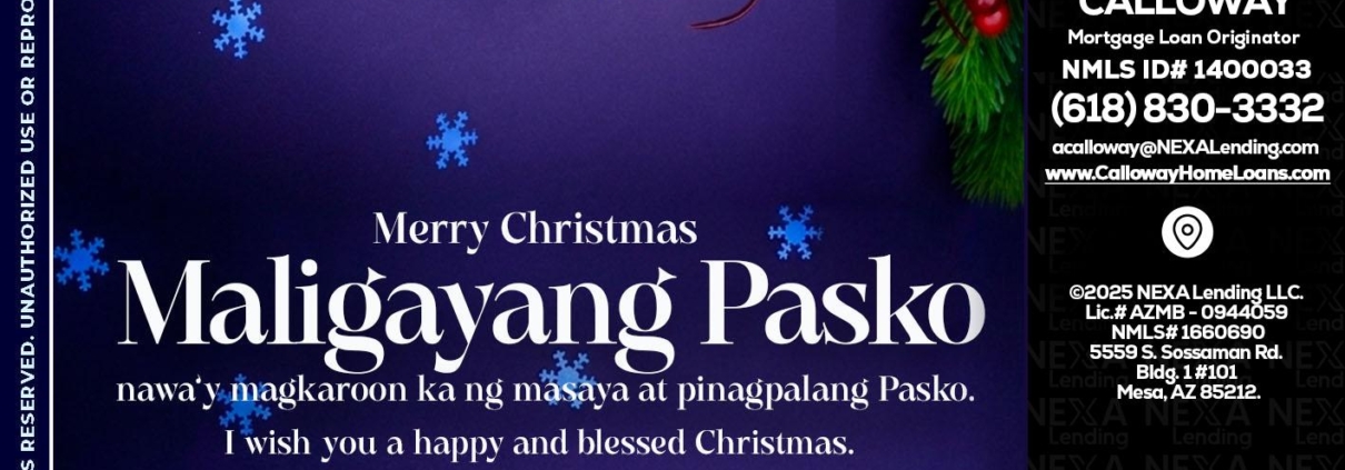 Maligayang Pasko - Andrew Calloway -Loan OfficerHi, my name is Andrew Calloway. I’m a Loan Officer with NEXA Lending LLC., offering personalized mortgage solutions, fast customized quotes, great rates and service with integrity.