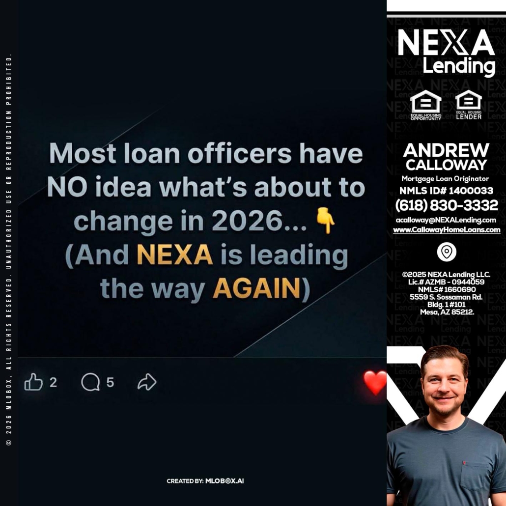 most loan officers - Andrew Calloway -Loan OfficerHi, my name is Andrew Calloway. I’m a Loan Officer with NEXA Lending LLC., offering personalized mortgage solutions, fast customized quotes, great rates and service with integrity.